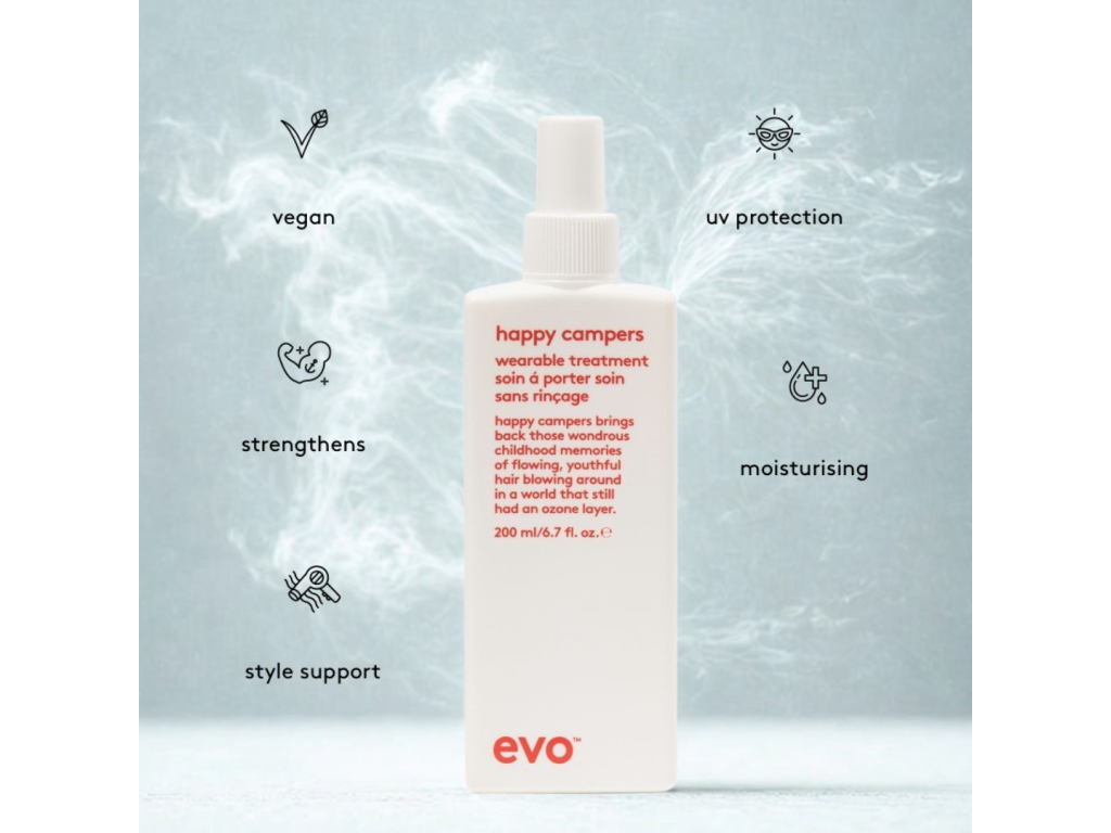 Happy Campers Wearable Treatment je bezoplachová péče, která hydratuje, posiluje a obnovuje poškozené vlasy. Usnadňuje úpravu vlasů, zlepšuje rozčesávání a urychluje foukání.