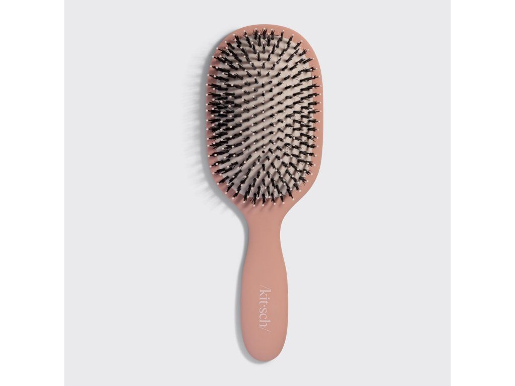 Veganské štětiny inspirované kančími vlasy uhlazují povrch vlasu a dodávají mu přirozený lesk, zatímco nylonové vlákna si poradí i s hustými a nepoddajnými prameny bez zbytečného tahání. Měkký, pružný polštářek se přizpůsobí tvaru hlavy a zajistí komfortní česání. Při používání stimuluje pokožku hlavy, pomáhá omezit lámání vlasů a rovnoměrně rozvádí přirozený maz pro zdravější a zářivější vzhled. Kartáč je ručně zpracovaný z kvalitních a šetrných materiálů s důrazem na dlouhou životnost.